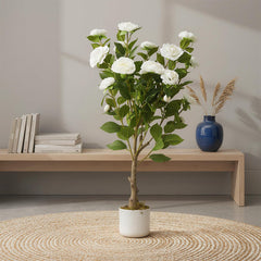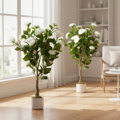 Albero di camelia artificiale con fioritura perenne e realismo impeccabile, in vaso elegante bianco maculato. Bassa manutenzione, perfetto per interni, esterni coperti e occasioni speciali.