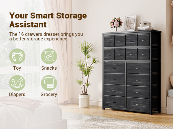 Scopri il comò Garvee con 16 cassetti salvaspazio: struttura in acciaio robusta, cassetti in tessuto resistenti e anti-ribaltamento. Organizzazione perfetta per camera, soggiorno o ufficio. Montaggio facile!