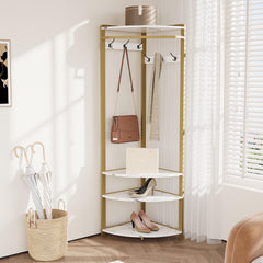 Armadio angolare Garvee con scarpiera, 6 ganci doppi, legno, robusta struttura antiribaltamento per corridoio e ingresso, salvaspazio, 70,8 pollici, marrone