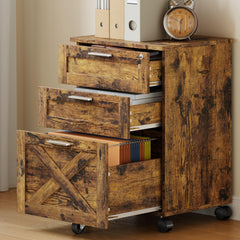Armadietto archivio 3 cassetti in legno massello con serratura, ruote frenanti e anti-ribaltamento. Spazio per A4/Legal, design elegante e resistente. Organizza il tuo ufficio con stile e sicurezza.