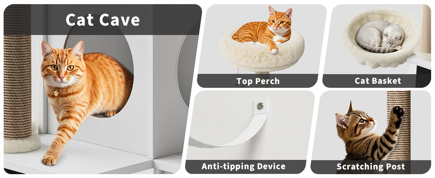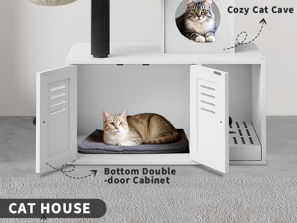Questo mobile 2-in-1 integra albero arrampicata, zona riposo confortevole e nascondiglio discreto per la lettiera. Soddisfa ogni bisogno naturale del tuo gatto, risparmiando spazio e armonizzandosi con l'arredamento domestico.